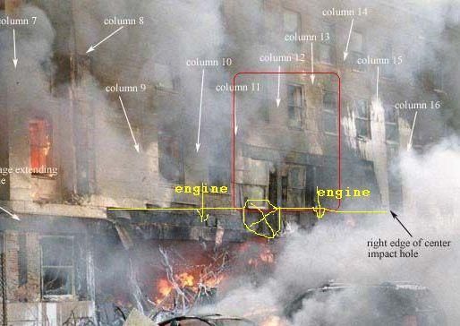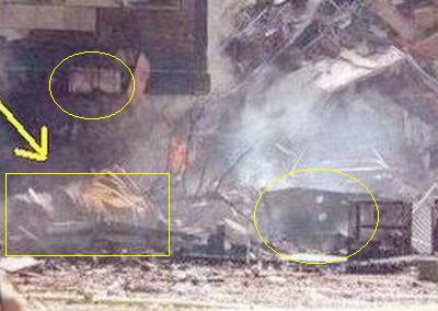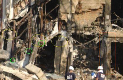 Witnesses reported a blast heard for blocks brought the Target Wall down 30 minutes after the A3 hit. This photo shows where explosive charges cut concrete columns circled in yellow and steel beams circled in green. An intact concrete column is highlighted in orange: