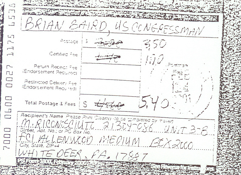 Certified mail receipt of letter sent to Congressman Brian Baird (D-WA) by Michael Riconosciuto on February 14, 2001